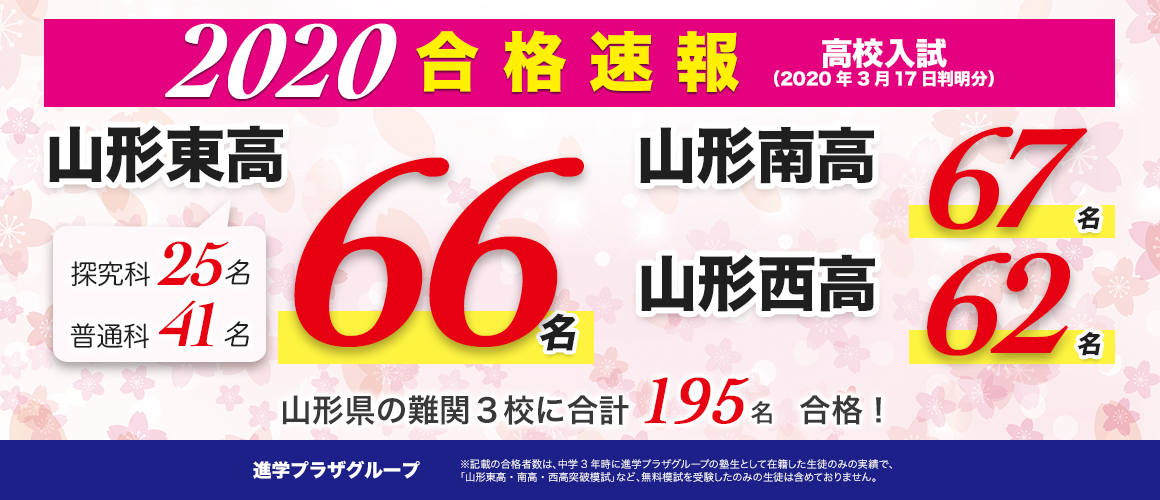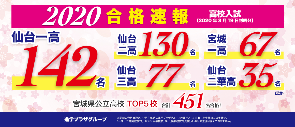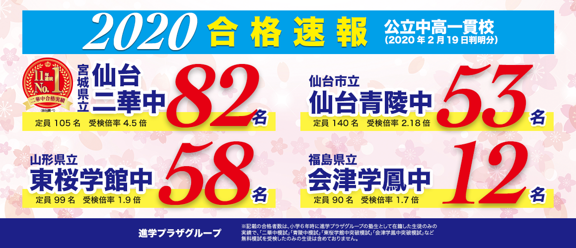 ※記載の合格者数は、小学6年時に進学プラザグループの塾生として在籍した生徒のみの実績で、「二華中模試」「青陵中模試」「東桜学館中突破模試」「会津学鳳中突破模試」など無料模試を受検したのみの生徒は含めておりません。