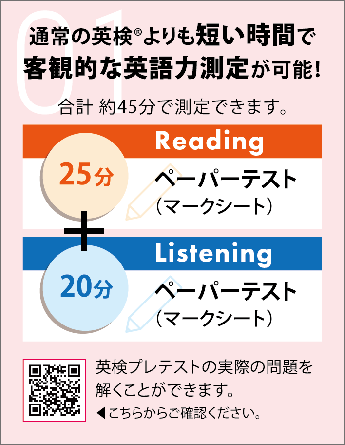 英検プレテストは、英検®における長年の問題作成ノウハウとデータに基づき日本英語検定協会によって開発されたアセスメントテストです。