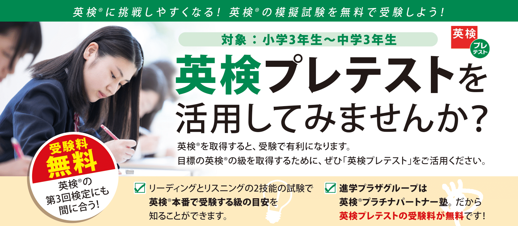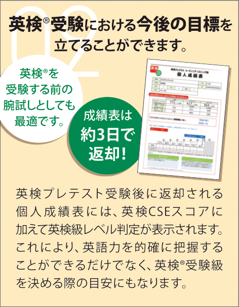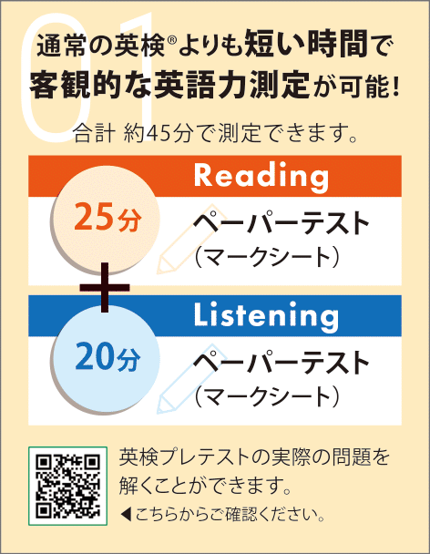 英検プレテストは、英検®における長年の問題作成ノウハウとデータに基づき日本英語検定協会によって開発されたアセスメントテストです。