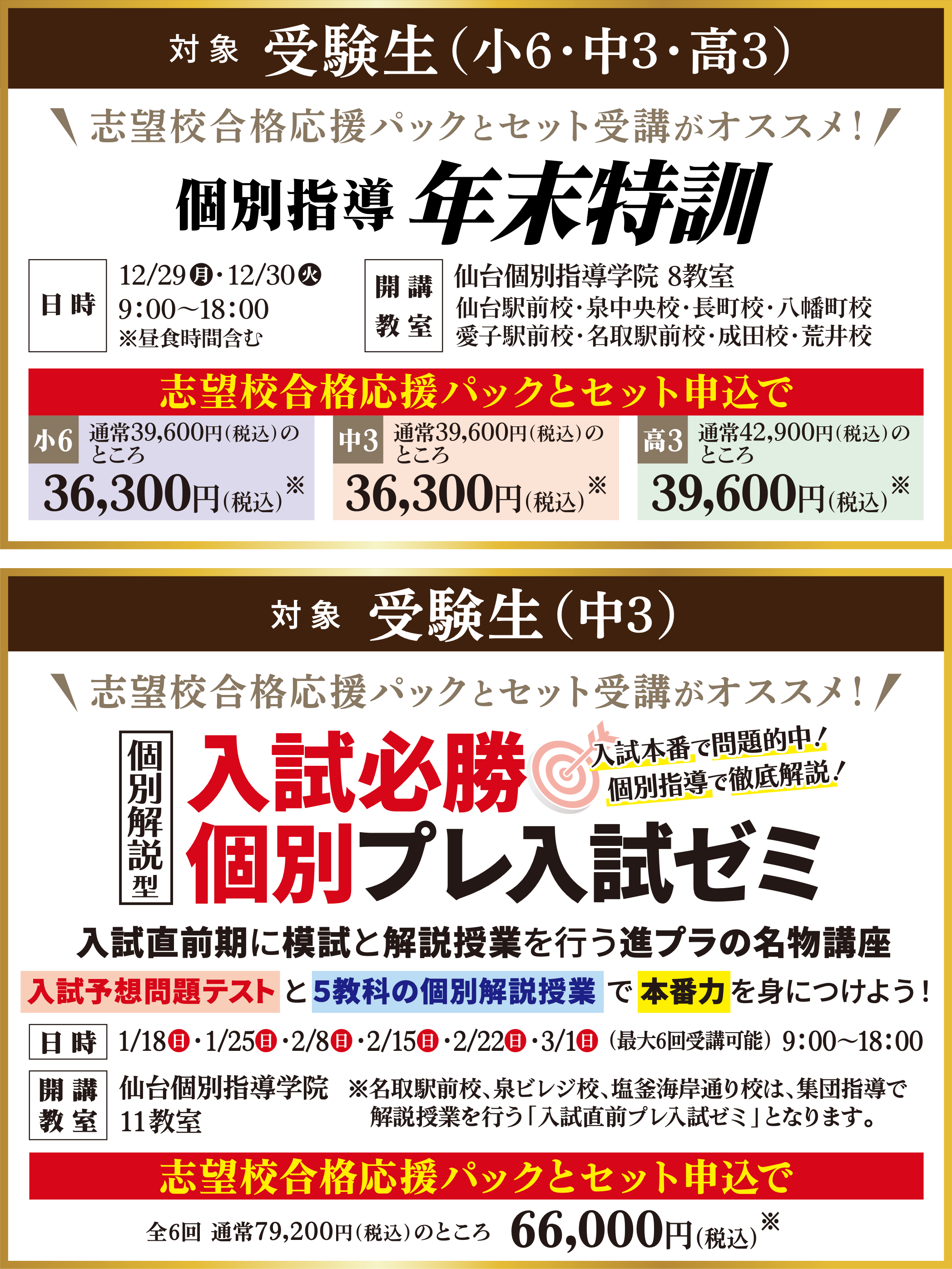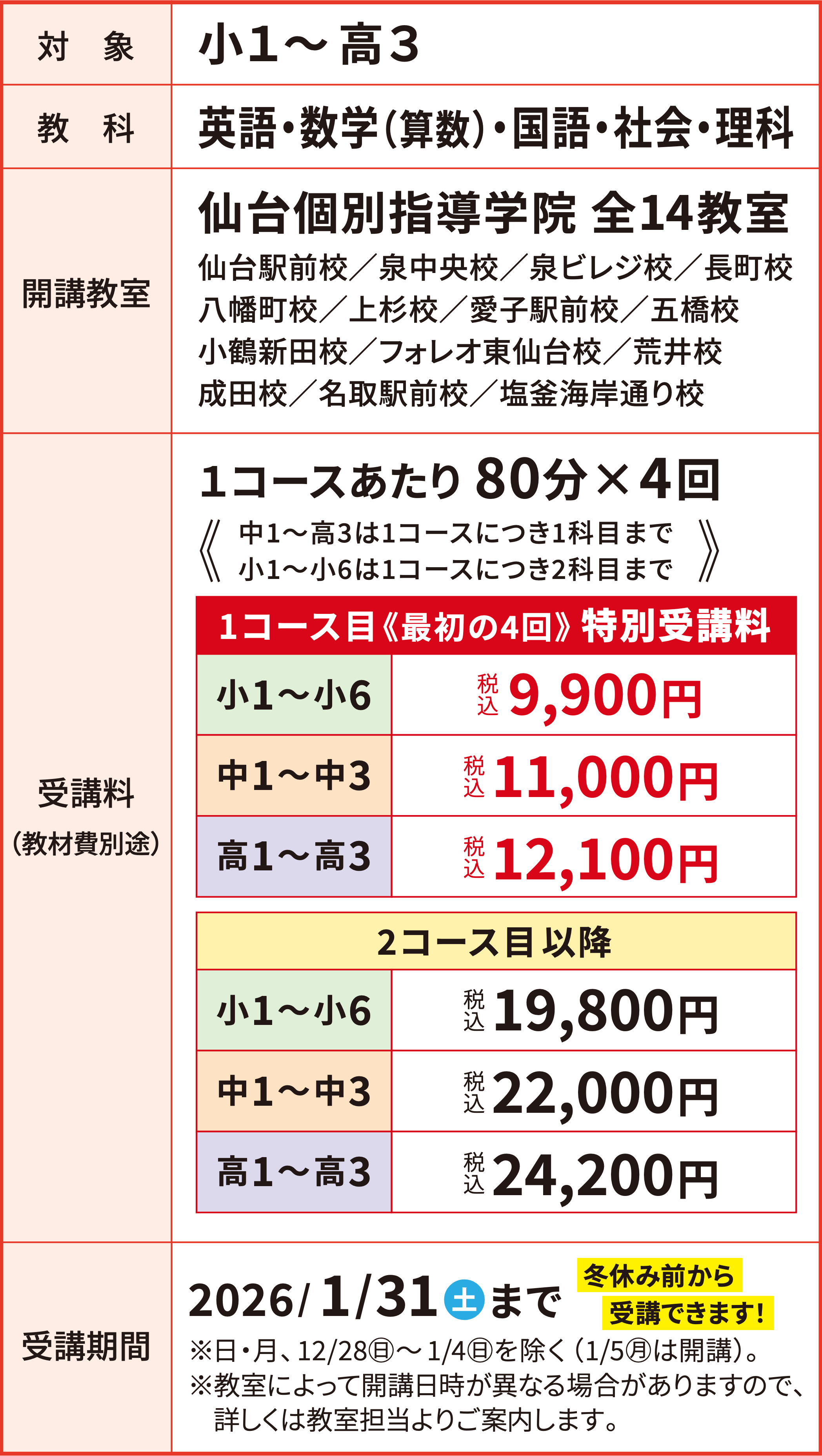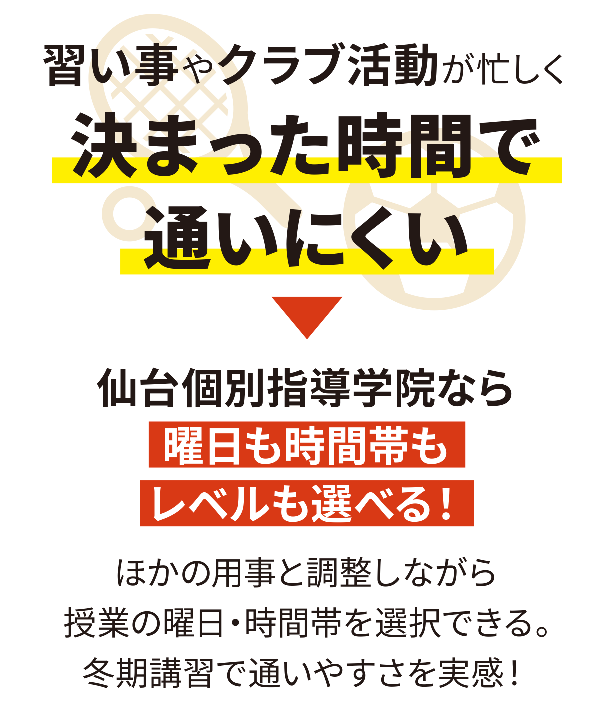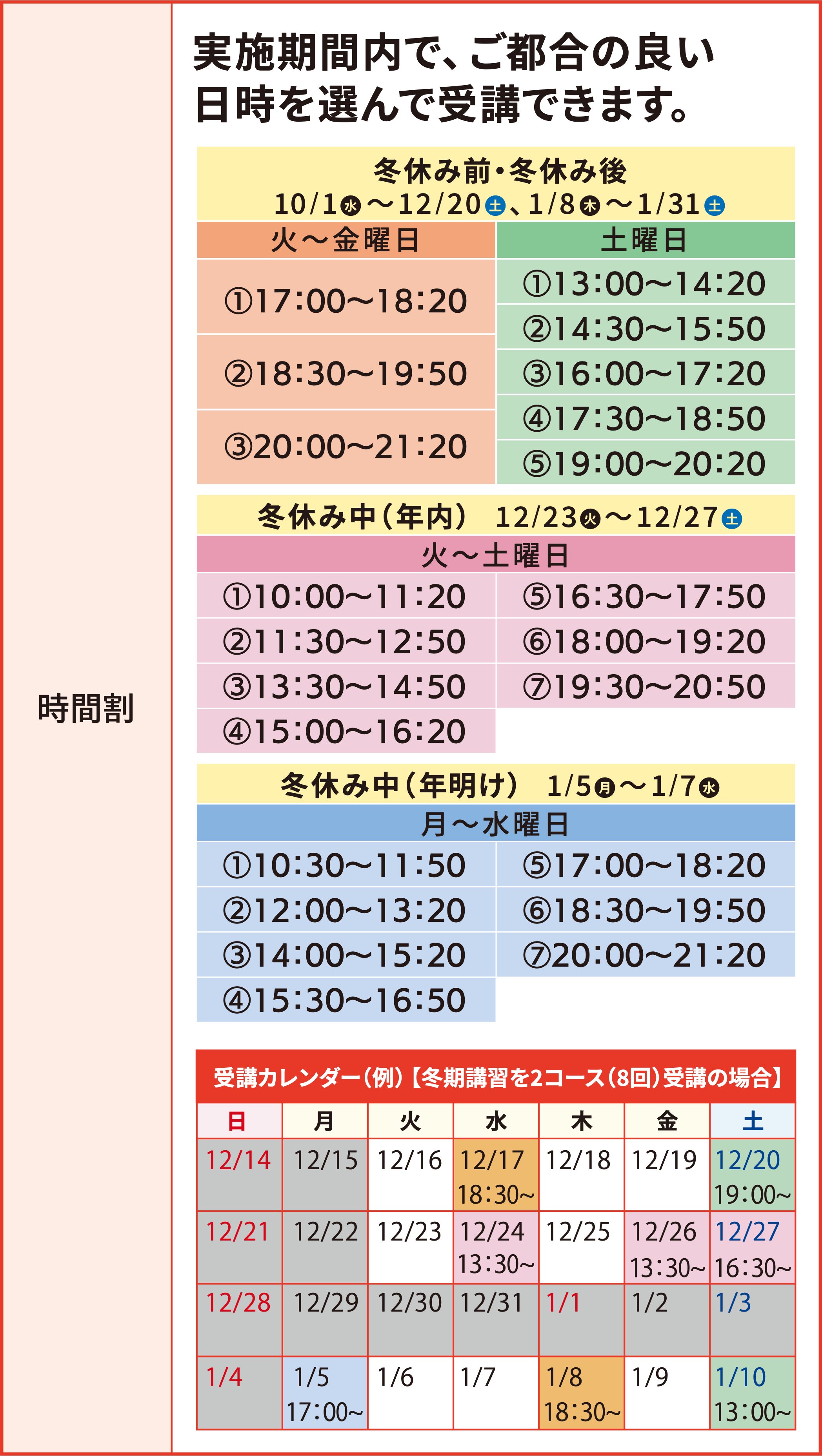 仙台個別指導学院の冬期講習は、実施期間内でご都合の良い日時を選んで受講できます。