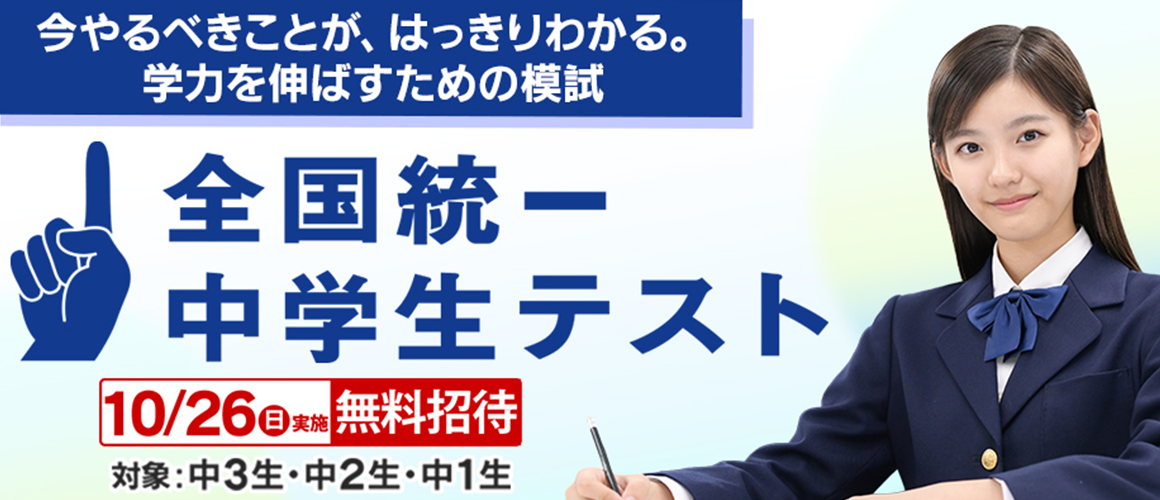 「全国統一中学生テスト」の申込受付が始まりました。 進学プラザグループも実施会場となっておりますので、ご希望の方は公式ホームページをご確認のうえ、お早めにお申し込みください。